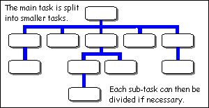 Traditionally programming was taught by teaching people to break things down into logical, progressive steps. Sometimes this is so easy you don't consciously do it. For example in the section on user defined characters, we have to set the character for the alien before making him walk across the screen. It wouldn't be any use to do this the other way round. Designing a 'proper' program follows a similar line but on a much larger scale. So much so that it might be days before we actually get round to typing in any code. The general advice is to concentrate on the generalities first, the big picture, and then break these tasks into progressively smaller ones until they get so small the code just drops out of its own accord.